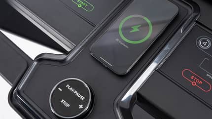 Auch dieses Modell kann zusammengeklappt werden, jedoch nicht ganz so flach wie das TM30. Dafür ist hier die Lauffläche etwas größer und der Aufbau allgemein stabiler. Mit 2,5 PS Motorleistung hat es bei gleicher Lautstärke etwas mehr Leistung. Die Steuerung funktioniert wieder über ein Drehrad oder bereits voreingestellte Geschwindigkeitsstufen. Dafür gibt es für Geschwindigkeit und Steigung jeweils 5 Direktwahltasten. Ein kleines Extra bietet die Wireless-Charging-Funktion über eine kleine Fläche neben den Steuertasten. Diese funktioniert einwandfrei und das Handy bleibt auch während intensiver Bewegungen dort liegen. Außerdem verfügt das Steuerungspanel über eine Tablethalterung.